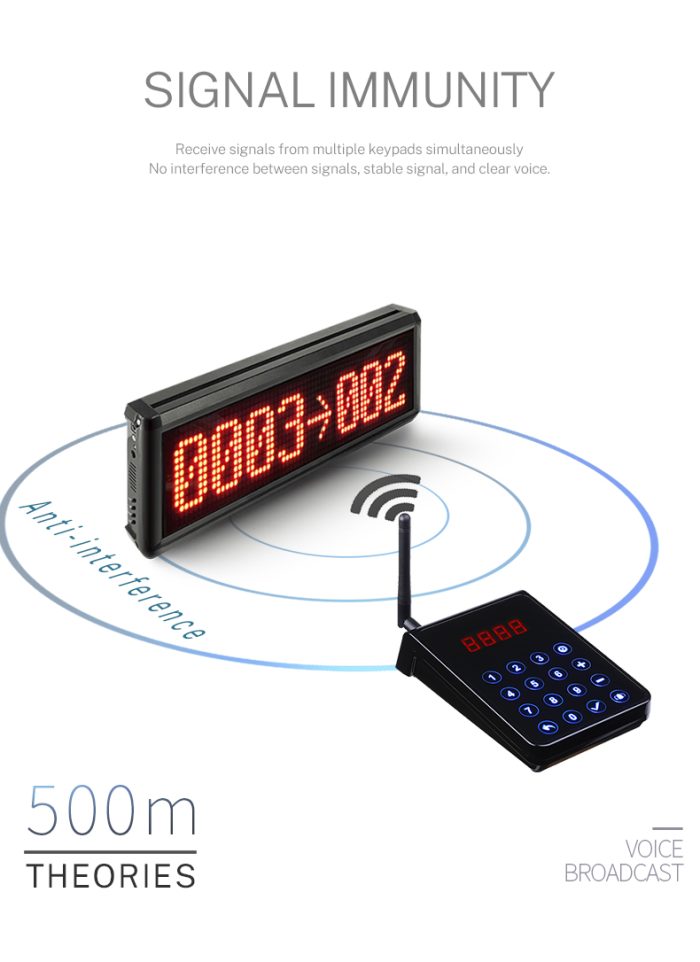 النظام مجهز لتقديم خدمة واحدة وشباك خدمة واحد فقط يستلم الزائر كارت مطبوع يحتوى على أسم المؤسسة و رقم الحضور لتلقى تلك الخدمة , وعند ظهور رقم حضور الزائر (المطبوع على الكارت) على الشاشة و الذى يصحبه تنبيه ضوئى متقطع و تنبيه صوتى يتجة لتلقى الخدمة.